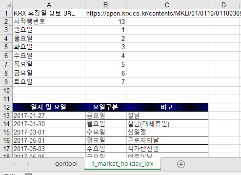 "2017-01-27", "금요일", "설날"입니다. 프로그램이 휴장일 판단에 실제 필요한 부분은 "일자 및 요일"로서