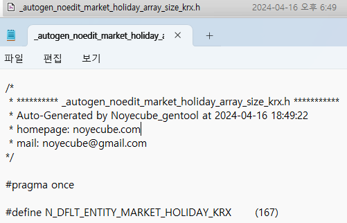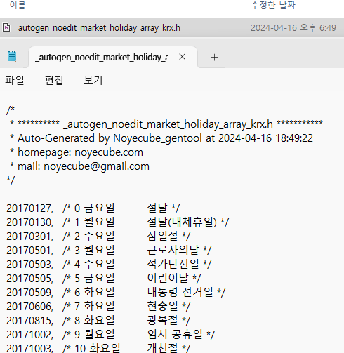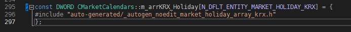 DWORD 타입의 배열 및 맵으로 관리하기 위하여 엑셀 매크로를 활용하여 YYYYMMDD 형식으로 변환 후 헤더파일을 생성하였습니다. 다음과 같이 관리하면 휴장일이 추가/삭제되더라도 간단하게 변경사항 적용 가능합니다. 소스코드에 포함하는 휴장일 정보는 휴장일 설정파일이 없을 때 기본 설정파일을 생성하기 위한 용도이며 지정 경로에 설정파일이 존재하면 설정파일로부터 휴장일 정보를 읽습니다.