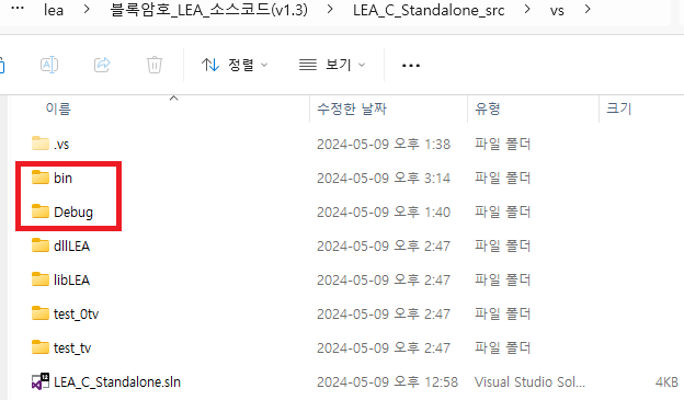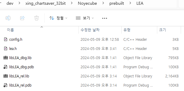 먼저 결과 파일을 프로젝트 경로에 복사합니다. 저는 "prebuilt\LEA" 경로에 복사하였습니다. 헤더파일은 "lea.h"와 "config.h"가 필요합니다.