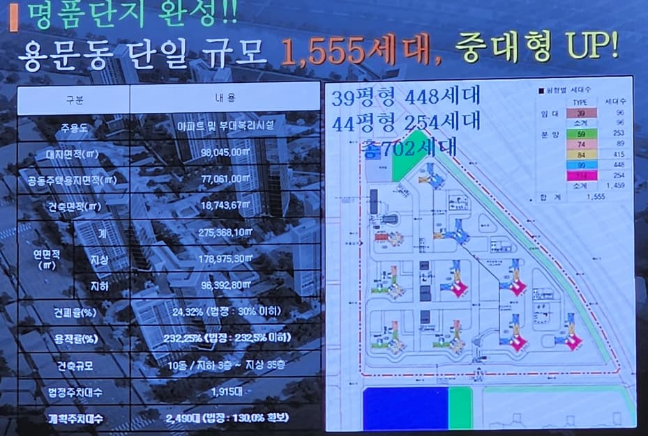 총 1,555세대 계획 중 34평형을 초과하는 39평형과 44평형 물량을 충분히 확보하여 대형평수 수요를 충족시켜 주겠다는 전략입니다. 발표자료의 "명품단지" 단어가 무색하지 않으려면 입지, 층간소음등급, 주차대수라고 생각하는데요, 계획되어 있는 주차대수는 2,490대로서 세대당 1.6대의 주차면을 확보하게 됩니다. 유성온천역과 각종 대중교통이 충분한 유성 호반베르디움의 주차대수가 세대당 1.3대 정도인데도 주차장에 모자람이 없는 것을 보면 유사하게 지하철역과 대중교통 노선이 좋은 용문4구역도 24시간 여유 있는 주차공간이 유지될 것으로 판단됩니다.