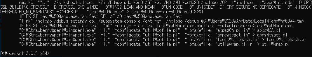 "nmake" 명령으로 OpenSSL 라이브러리를 빌드합니다. 컴파일 타임이 상당히 오래 걸리네요. 4가지 버전 만들어야 하는데 한번 할 때마다 30분 걸리네요.
