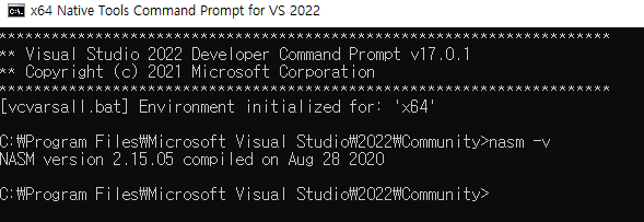 nasm-2.15.05-installer-x64.exe를 받아서 설치했습니다.
