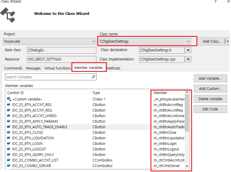 그리고 Class Wizard를 열어서 아래와 같이 위에서 만든 각 컨트롤에 대응되는 멤버변수를 CDlgEbestSettings 클래스에 만들어줍니다. 저는 Control 타입의 변수를 선호해서 아래와 같이 추가했습니다.