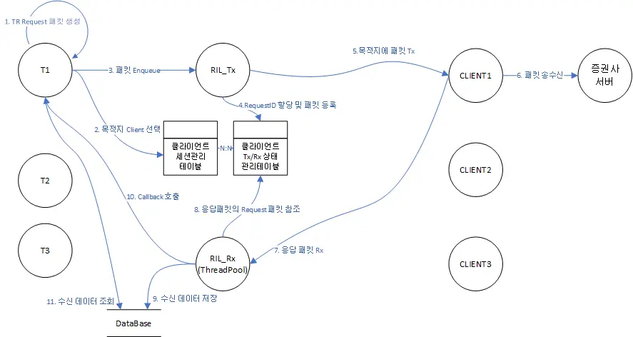 서버의 매매전략 스레드 T1이 TR요청을 한다고 가정하면 송신부터 수신까지 대략 9단계의 단계로 이루어집니다.