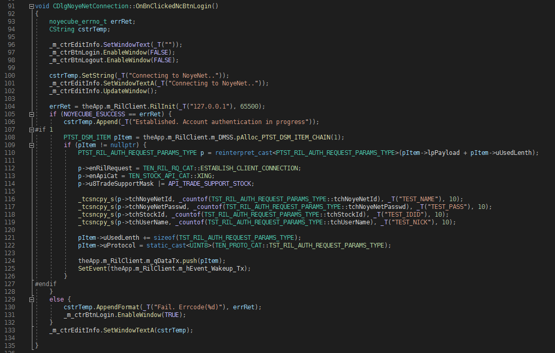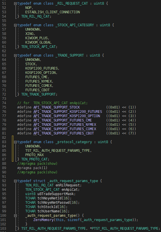 ESTABLISH_CLIENT_CONNECTION으로 정했습니다. 서버 입장에서는 지금 접속한 API커넥터가 어느 증권사를 지원하는지 알아야 하므로 TEN_STOCK_API_CAT에 값 XING을 넘기기로 하였습니다. 그리고 증권사 계정별로 API에서 거래 가능한 마켓이 다르므로 거래가능 마켓은 MASK에 표기하여 서버측에 전달하기로 하였습니다. 그리고 네 개의 TCHAR 문자열은 계정명과 패스워드, 증권사 계정명과 닉네임입니다.