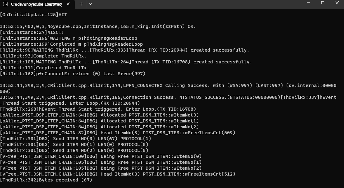 디버깅 메시지를 확인하면 vAllock_PTST_DSM_ITEM_CHAIN(3)이 호출되어 실제로 메모리 객체 0번, 1번, 2번 총 3개를 할당했고 1번 객체에 로그인패킷이 기록되어 서버로 전송되었습니다. 그 뒤에 다시 vFree_PTST_DSM_ITEM_CHAIN이 호출되어 0, 1, 2번 객체가 제대로 반환되어 wFreeItemCnt값이 전체 메모리 풀 객체 수 512를 표시하는 것을 볼 수 있습니다.