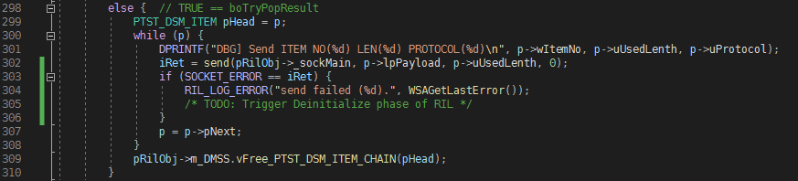 전송큐에 데이터 삽입 후 전송스레드에 wakeup 이벤트를 발생시켜 깨우면 전송스레드가 깨어나서 패킷을 서버로 전송합니다. 아래와 같이 패킷 Chain head 포인터 p가 유효하면 uUsedLength 만큼씩 send를 호출하고 데이터 전송이 완료되면 루프를 탈출 후 vFree_PTST_DSM_ITEM_CHAIN을 호출하여 메모리 객체 노드를 다시 반환합니다.