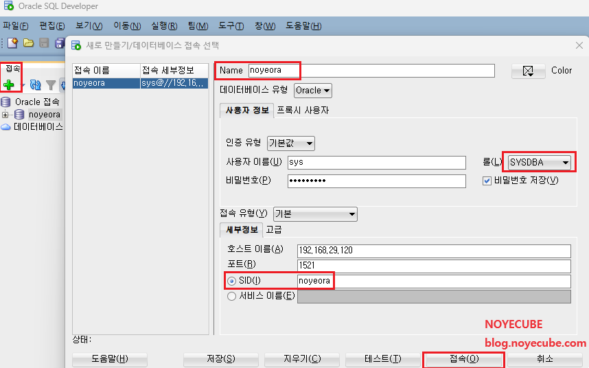 다음 참고 화면과 같이 SQL Developer를 통해 DB 서버에 접속합니다.