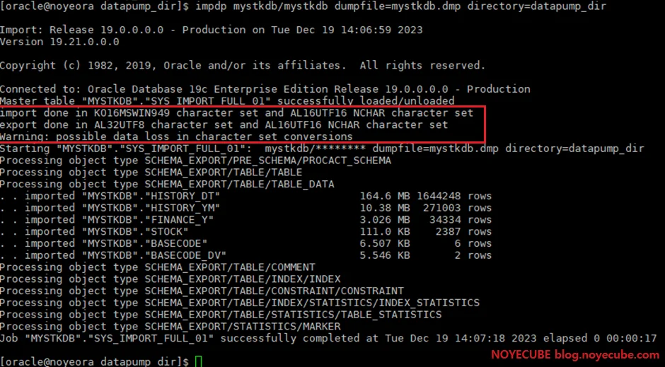 impdp 로그를 보면 export 캐릭터 셋이 AL32UTF8이고 import 캐릭터셋이 KO16MSWIN949임을 확인할 수 있으며 캐릭터셋 변환으로 인해 데이터 손실이 발생할 수 있다는 경고문이 있습니다. 어쨌든 성공했으니 실제 데이터를 확인해 보면 됩니다.