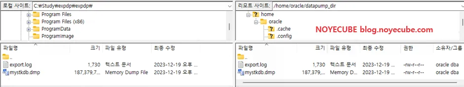 제공받은 dump 파일의 계정명은 "MYSTKDB"이고 대상 DB의 "DATA_DIR=/oradata/NOYEORA/"입니다.