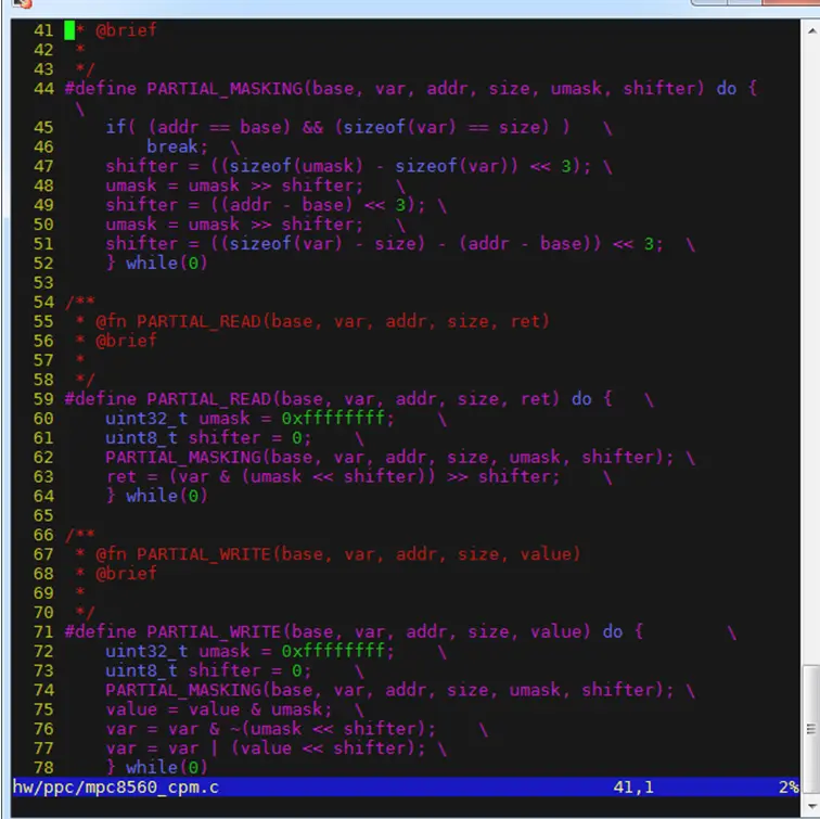 에뮬레이션 과정은 많은 부분이 레지스터 조작에 할애된다. 레지스터는 비트 연산자를 이용하는데 이 또한 매크로를 사용하지 않으면 코드 가독성이 떨어진다. 보통 레지스터 조작 시 X번 비트부터 Y비트 크기만큼 읽어서 값을 조작 후 다시 같은 자리에 쓰는 작업을 한다. 그래서 부분 조작이라는 의미의 접두사를 붙인 PARTIAL_XXX 매크로를 정의하여 사용하였다.(아래 그림 참조)