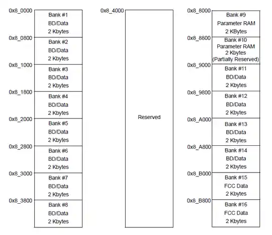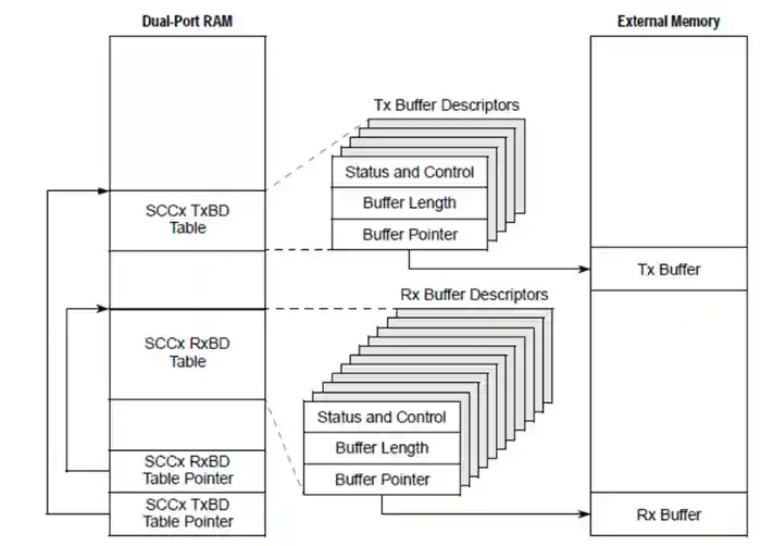 SCC 채널과 관련있는 데이터는 Dual-port RAM의 Buffer Descriptor(BD) 영역에 저장된다. 이 값들은 모든 시리얼 컨트롤러들이 서로 공유한다.