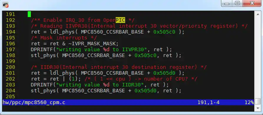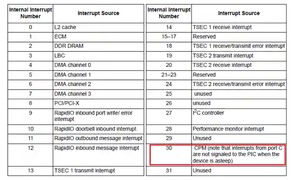 CPM이 발생시키는 IRQ를 코어 프로세서로 전달하기 위해서는 이 함수를 이용하여 설정해야 한다. 이를 위해서는 CPM이 할당받은 내부 인터럽트 번호를 확인해야 한다. 아래 그림을 보면 내부 인터럽트 번호로서 30번이 할당되어 있는 것을 확인할 수 있다. 하지만 앞의 QEMU 코드는 “mpic [46]”을 인자값으로 넘기는 것을 볼 수 있는데 이는 QEMU가 외부 인터럽트와 내부 인터럽트를 하나의 배열에서 관리하기 때문에 0 ~ 15까지의 “mpic” 배열 인자는 외부 인터럽트에 할당되어 있기 때문이다.
