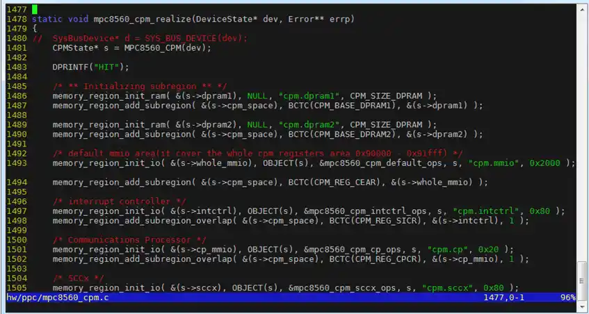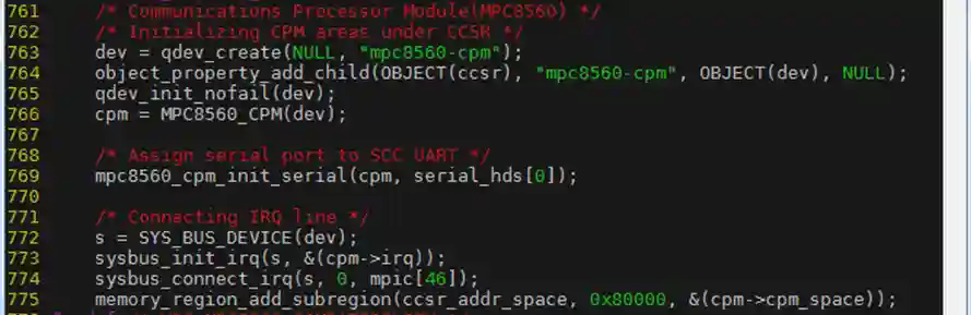 현재 구현하고자 하는 CPM은 PowerPC 아키텍처의 e500 프로세서 기반 보드의 주변장치 이므로 e500 프로세서가 구현되어 있는 "hw/ppc/e500.c”파일의 “ppce500_init”함수에 위 초기화 코드를 삽입한다. 이때 호출되는 각각의 함수가 수행하는 역할은 아래와 같다.