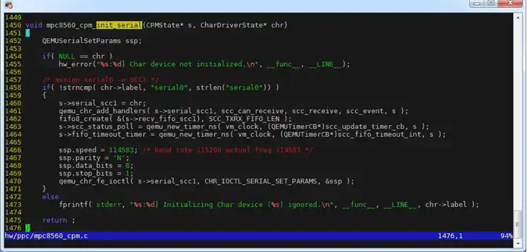 앞서 create함수로 CPM 오브젝트를 생성했고 그 오브젝트를 CCSR의 하위 모듈로 등록을 마쳤다. 이제 실제 동작을 할 수 있도록 init함수를 호출한다. 이 함수는 qdev_init 함수와 유사하지만 에러가 발생했을 경우 그 에러값을 리턴하는 대신 프로그램을 종료한다. - void mpc8560_cpm_init_serial(CPMState *s, CharDriverState *chr)