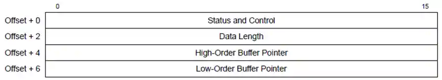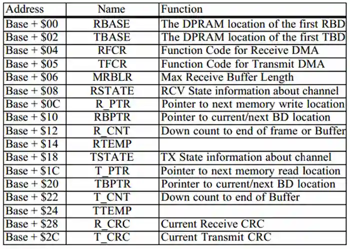 위 그림에 따르면 SCC 1번 채널이 할당되어 있는 Dual-port RAM의 메모리 뱅크 베이스로부터 오프셋 +2 위치에 TBASE 주소값이 있는 것을 알 수 있다. TBASE에는 TX buffer descriptor table이 존재한다. 이 테이블의 정보는 아래와 같다.