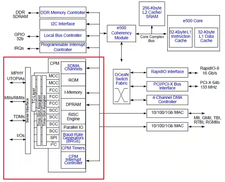 타깃 보드는 PowerPC 아키텍처 기반의 MPC8560이고 이 보드의 UART 기능을 구현하는 것을 목표로 한다. QEMU에서 제공하는 PowerPC 아키텍처 기반의 기본 타깃보드는 MPC8544이다. MPC8544와 MPC8560의 차이점은 communication processor module(CPM)의 유무이다.(아래 그림의 빨간 네모박스 부분의 모듈이 통째로 없고, 여기서 UART 기능에 필요한 부분을 직접 구현해야 한다.)