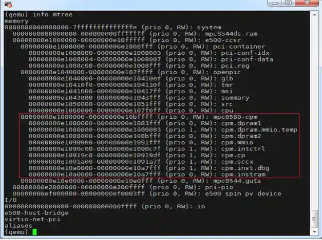 기존의 메모리 영역에 하위 영역을 트리 형식으로 추가하는 함수이다. CPM의 메모리 영역이 CCSR 메모리 영역의 시작점으로부터 오프셋 0x80000에 위치하므로 오프셋 인자로 0x80000을 전달했다. 그 결과는 아래 그림을 통해 확인할 수 있다. QEMU에서 “ctrl+a+c”입력을 통해 QEMU 모니터 모드로 진입할 수 있으며 이 상태에서는 내부 시스템의 모든 정보를 확인할 수 있다. “info mtree”명령어를 통해 메모리 트리정보를 확인할 수 있다. 전체 시스템의 메모리가 최상위에 위치하고 있고 “mpc8560-cpm”의 메모리 영역은 “e500-ccsr”의 하위에 위치하고 있는 것을 확인할 수 있다. “mpc8560-cpm”의 하위 메모리 영역은 CPM 디바이스에서 추가적으로 등록했다.