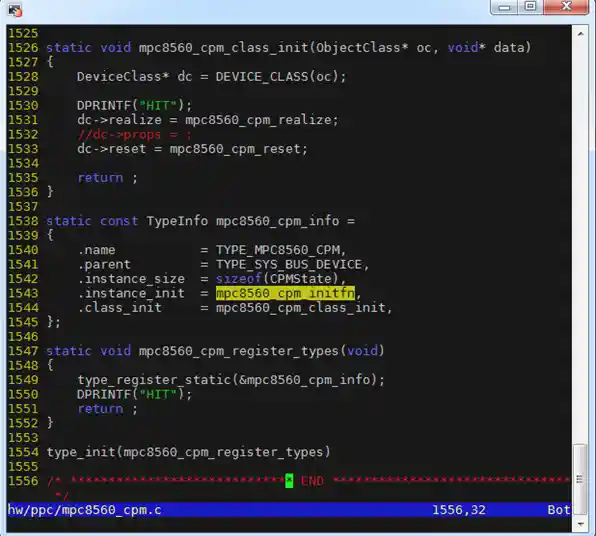 새로 추가한 장치의 초기화 함수가 호출되기 위해서는 type_init() 함수를 이용한다. 그전에 TypeInfo 타입의 구조체에 장치 이름과 초기화 때 호출될 함수 포인터를 저장해 두면 된다. 실질적으로 장치 초기화를 수행하는 함수는 접미사에 _realize가 붙은 함수이고 CPM에서는 CPM의 하위 메모리 영역을 초기화했다.