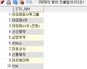 '*' 대신 "STK_NM"으로 조회할 경우 아래와 같이 해당 열만 선택되어 조회됩니다.
