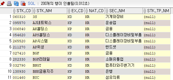 예제 테이블에서 STK_NM을 기준으로 정렬하여 데이터 조회를 하려면 다음과 같이 조회합니다.