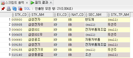 WHERE STK_NM LIKE '삼성%';