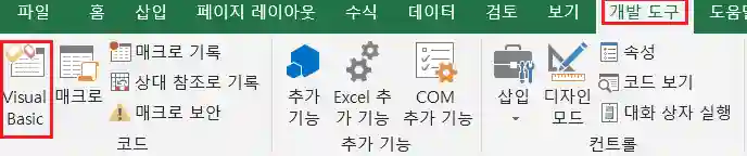 엑셀에서 VBA를 사용하기 위해서는 개발도구 메뉴를 활성화해야 아래 그림처럼 해당 기능 버튼이 활성화 됩니다.