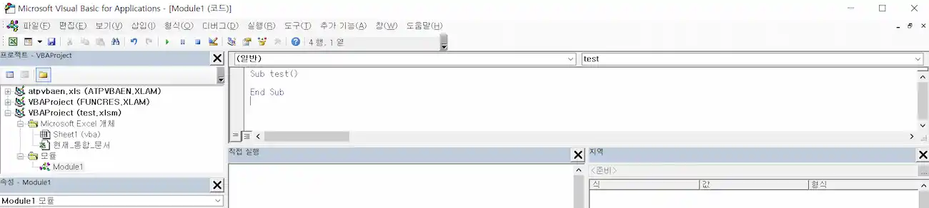 그럼 아래와 같이 VBA 창이 뜰겁니다. Sub test() ~ End Sub 사이에 테스크 코드를 작성할 겁니다. 테스트코드를 복사해서 붙여 넣어 보세요.