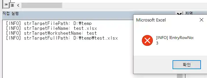 MsgBox를 사용하면 팝업 메시지창을 발생시킵니다. Debug.Print와 마찬가지로 문자열은 쌍따옴표 사이에 쓰고, 변수는 & 문자로 연결합니다.