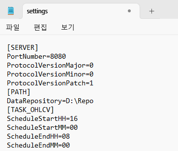 ini 파일은 SECTION, KEY NAME, KEY VALUE로 구분된다. 샘플 파일에서 [SERVER], [PATH], [TASK_OHLCV]는 SECTION이고