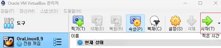 가상머신이 생성되었으면 "시작"을 눌러서 부팅시킵니다.