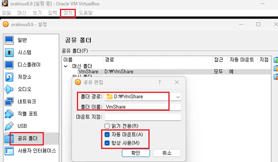 이제 호스트 PC와 가상 머신 간 공유폴더를 설정합니다. 장치-공유폴더-공유폴더설에서 공유할 호스트 PC의 폴더경로를 지정하고 가상 머신에서 사용할 폴더이름을 입력합니다. "자동마운트", "항상 사용"으로 설정합니다.
