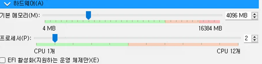 하드웨어와 하드디스크 설정이 필요합니다. 아래를 참고하여 하드웨어 사양에 맞게 설정 후 저장해 줍니다.