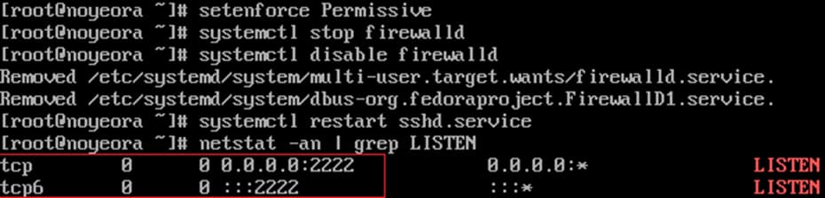 $ su - root # setenforce Permissive # systemctl stop firewalld # systemctl disable firewalld # systemctl restart sshd.service # netstat -an | grep LISTEN |
