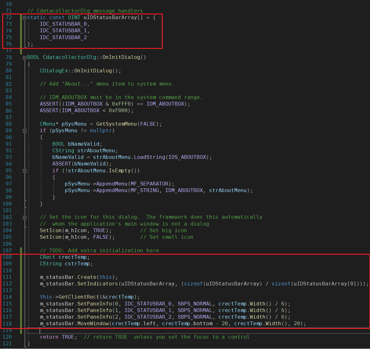 상태 바에 3개의 상태칸을 만들고 싶어서 OnInitDialog()에 아래와 같이 작성하였습니다.