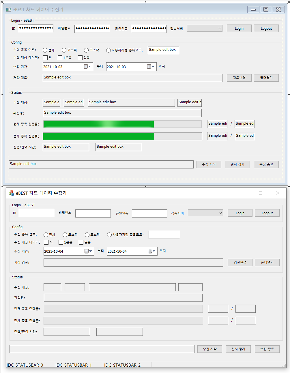 아래는 완성된 화면입니다. 로그인 후 수집할 종목, 수집할 데이터 타입, 수집 기간, 저장 경로를 설정할 수 있도록 하였습니다. 상태 창에서는 현재 수집 중인 종목정보와 전체 진행률, 잔여시간을 확인할 수 있도록 컨트롤을 배치하였습니다.