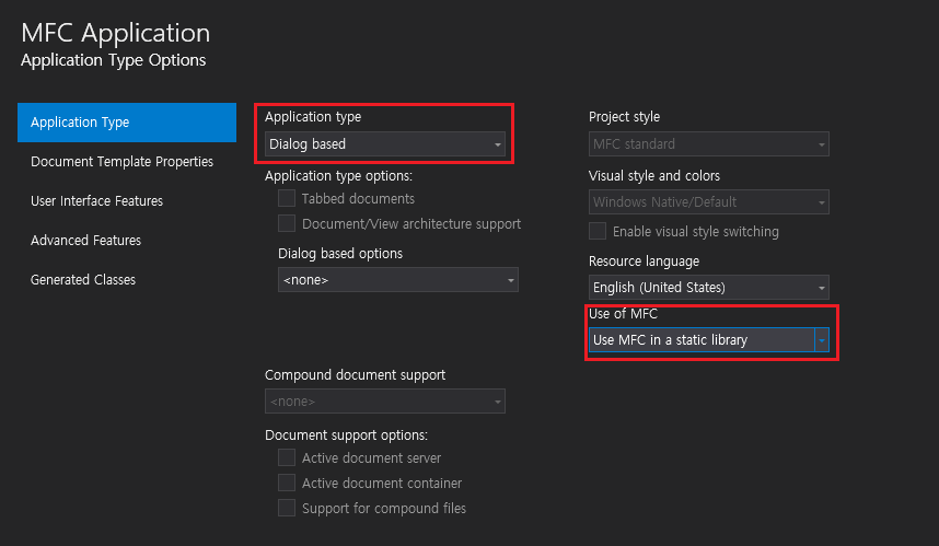 Application type은 "Dialog based", Use of MFC는 "Use MFC in a static library"로 선택합니다.