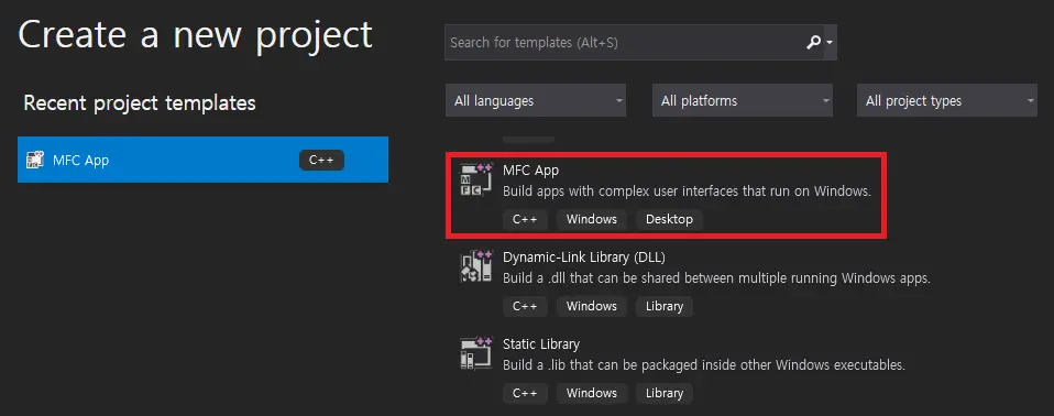 MFC App 프로젝트를 생성합니다. MFC App 프로젝트 템플릿이 안 보이면 Visual Studio Installer를 실행하여 MFC 구성요소 추가 설치를 진행해 주세요.