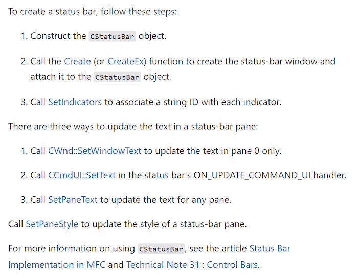MSDN에서 참조한 아래의 status bar 생성방법 확인 후 코드를 작성합니다.