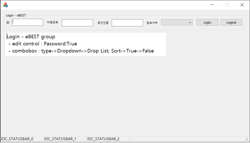 추가로 로그인 정보 입력을 위한 컨트롤 배치를 완료 후 "ctrl+F5"로 확인하면 아래와 같이 상태 바 생성이 완료된 것을 확인할 수 있습니다. 로그인 컨트롤 배치 시 EDIT 컨트롤은 password 속성을 True, 접속서버 선택을 위한 Combobox 컨트롤의 type 속성은 Drop List로, Sort 속성은 False로 설정하였습니다.