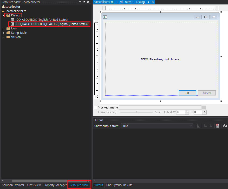 Resource View 탭 선택 후 기본 Dialog를 선택하면 필요한 컨트롤들을 배치하여 화면을 구성할 수 있습니다.
