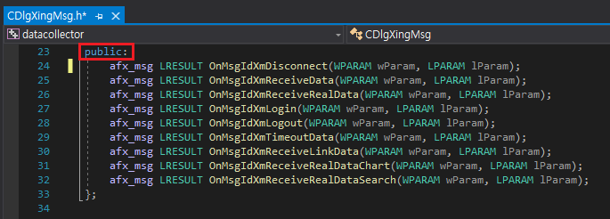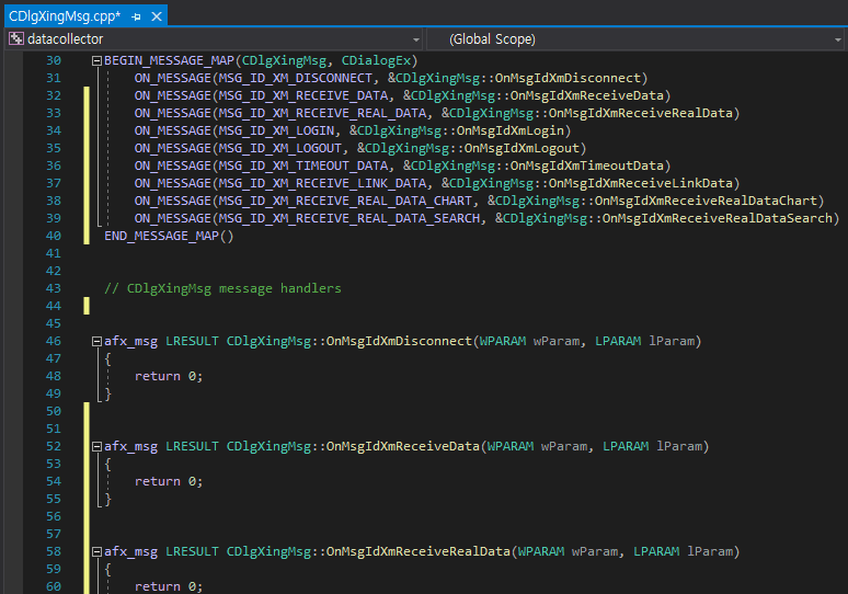 등록을 완료하고 CDlgXingMsg에 가보면 아래와 같이 메시지 맵과 메시지 핸들러가 생성된 것을 확인할 수 있습니다.