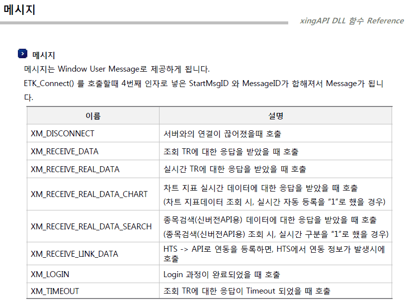 xingAPI DLL 함수 Reference를 보면 API가 사용하는 8개의 Window User Message가 있습니다.