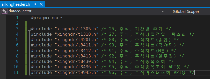 그리고 이 헤더파일들을 일괄적으로 include 할 수 있는 "allxingheaders.h" 파일을 생성하여 그 파일에 xinghdr에 복사한 헤더파일들을 include 합니다.