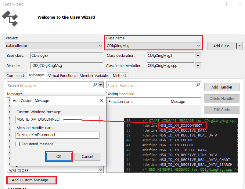 CDlgXingMsg Class에 메시지맵을 등록하고 메시지 핸들러를 생성할 차례입니다.