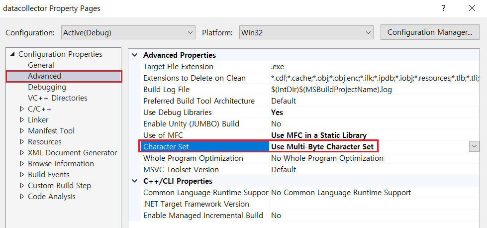 Project->Configuration Properties->Advanced->Character Set->Use Unicode Character Set을 Use Multi-Byte Character Set으로 변경합니다.
