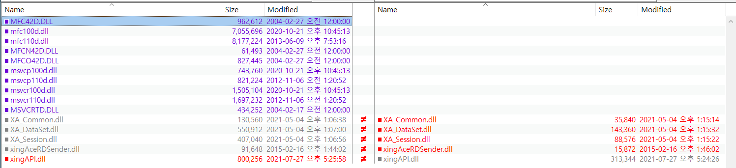 각각 다운로드하여서 비교해 보면 아래와 같이 DEBUG버전에는 파일 뒤에 d 가 붙어있고 xingAPI.dll 용량도 더 큽니다.