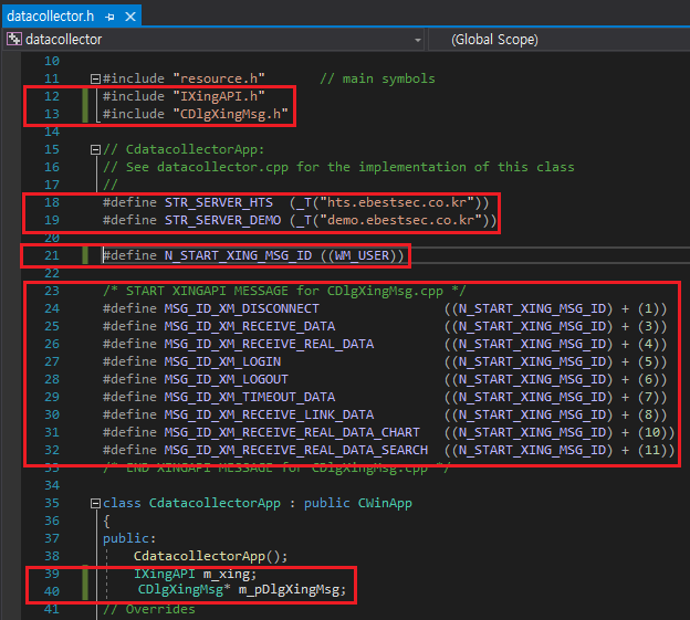 그리고 App 클래스에 멤버변수로 IXingAPI m_xing, CDlgXingMsg* m_pDlgXingMsg를 선언해 줍니다.