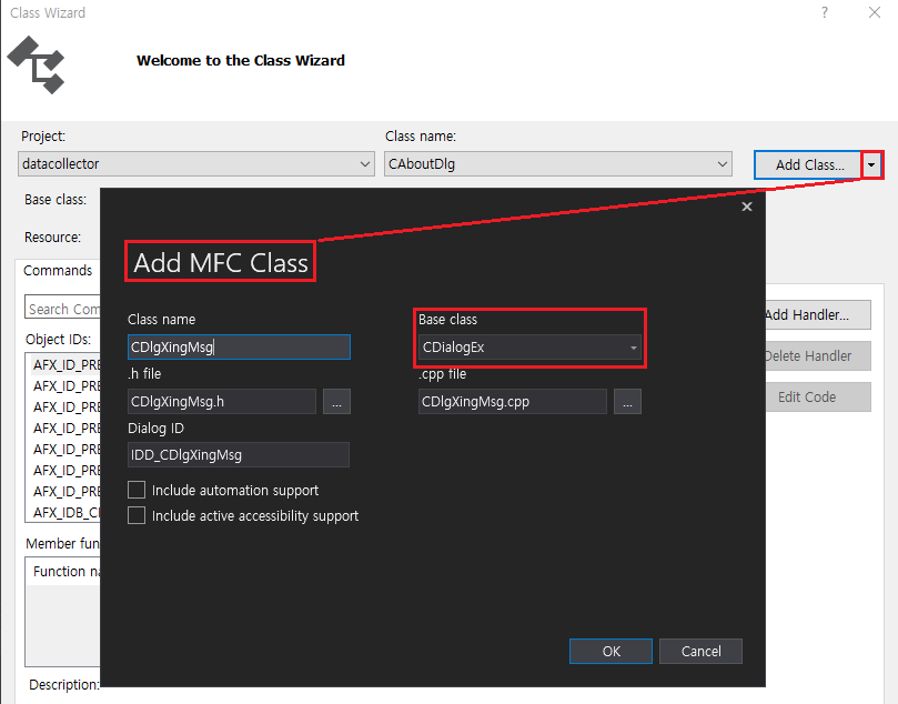 Window User Message는 User Interface Thread로 생성된 Dialog로 처리할 수 있습니다. 기본 Dialog에서 처리해도 되지만 메시지 처리를 전담하는 별도의 Dialog Class를 생성하겠습니다. Class Wizard에서 Add MFC Class 창을 띄워서 base class는 CDialogEx로 하고 Class name은 "CDlgXingMsg"로 합니다.