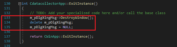그리고 CDlgXingMsg의 Create 코드를 작성해 주고 ExitInstance()에 Delete 코드를 작성해 줍니다.
